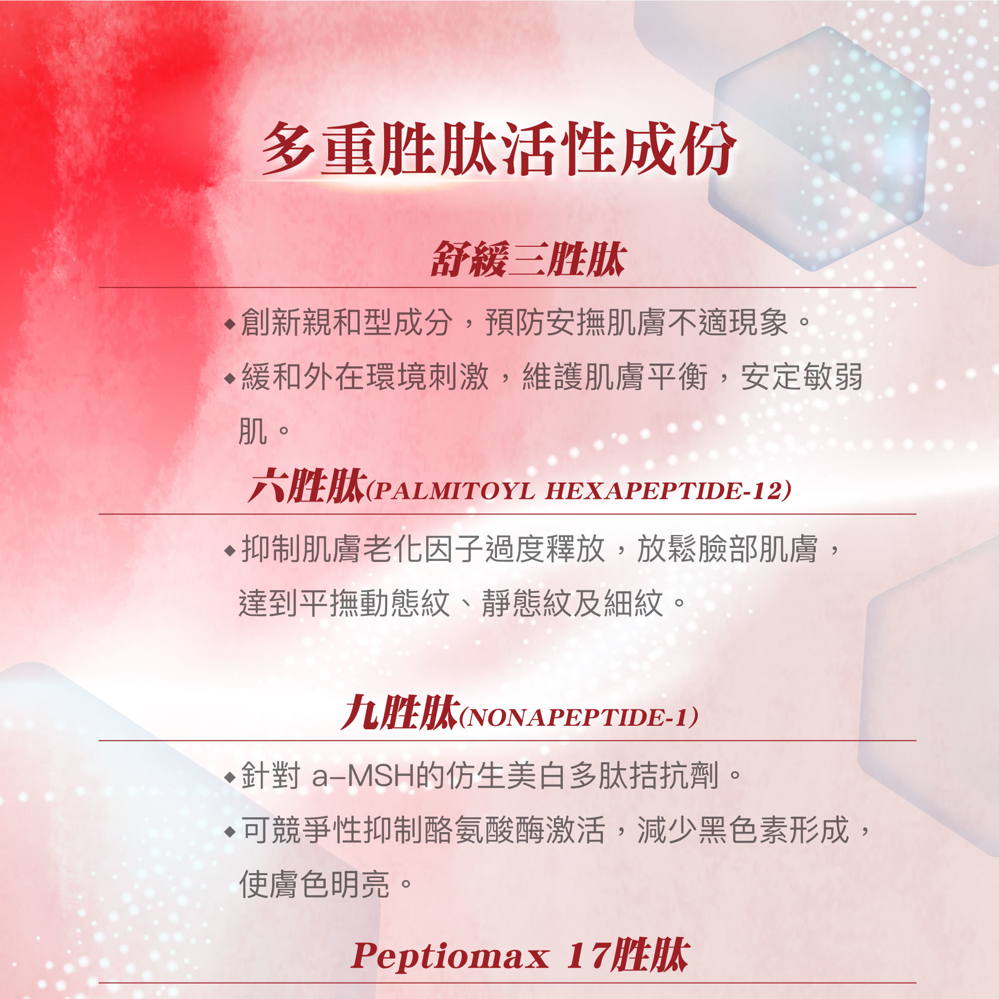 ★多重胜肽活性成份,有效抗皺及修護肌膚、恢復彈性