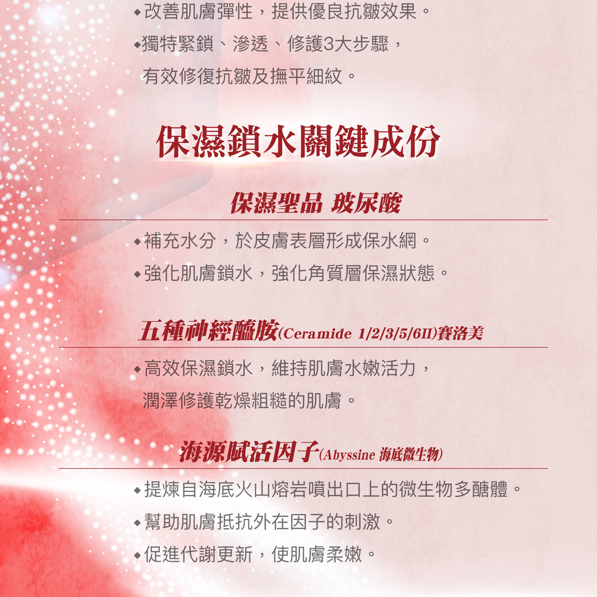 ★五種複合神經醯胺及玻尿酸,高效保濕修護成份
